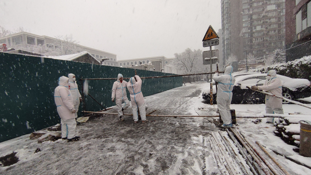 开工就是决战,入场就是冲刺,突击队员们从换上隔离服的那一刻起便开始了紧张的工作,搬运、搭设、固定、再搬运,不敢有丝毫的懈怠与停顿。然而天气却在午后急转直下,突然出现了较大降雪,气温也骤降至冰点以下。突击队员们戴的棉质手套全部被雪水浸透,很多人的鞋子也都湿透了,在这样的环境下搭设钢管围挡,手脚很快就被冻得麻木了,施工难度之大可想而知。