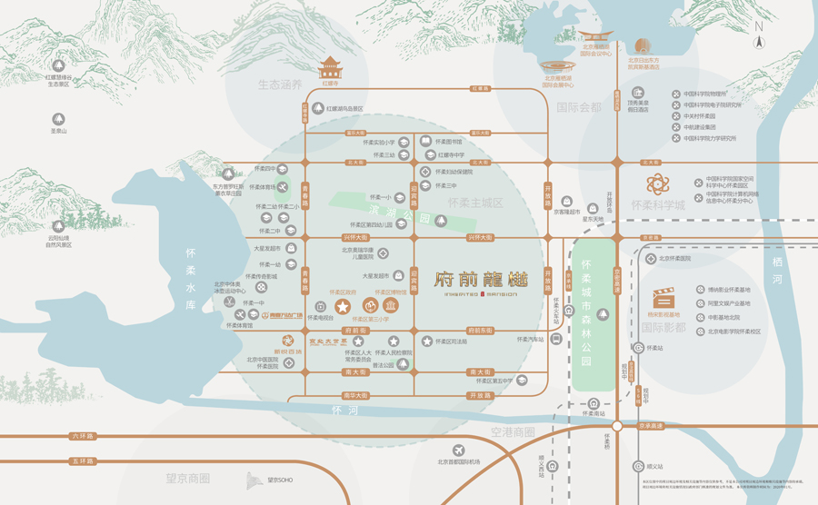 北京城建·府前龙樾项目位于北京市怀柔区主城区的核心位置,总占地8.1万㎡,总建面25.4万㎡。项目由27栋建筑组成,整体容积率约2.1,绿化率30%,住宅总户数978户,车位数1467个,车位配比1:1.5。